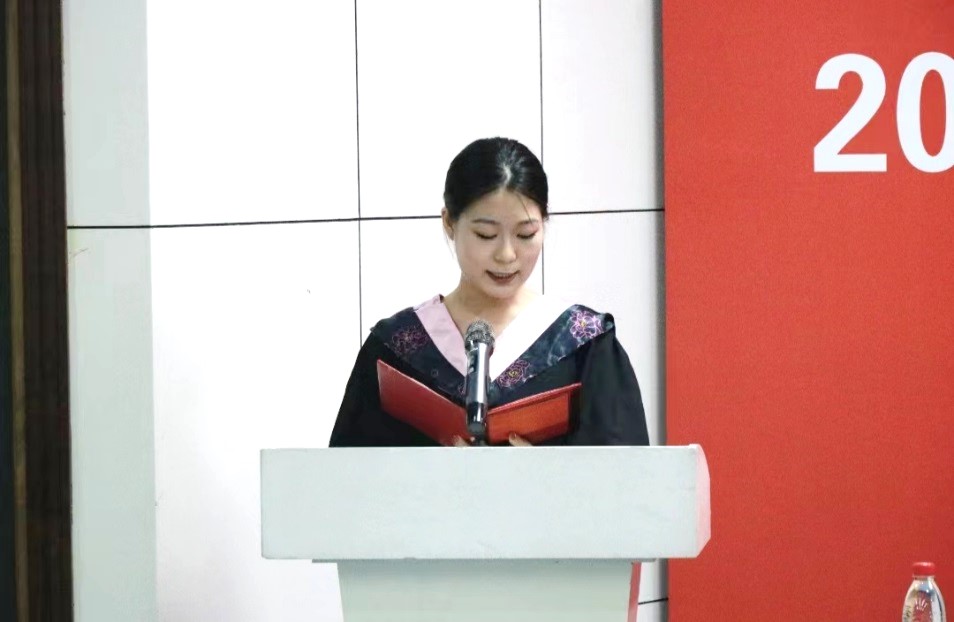 毕业生代表工艺美术一班的孙昀玲代表全体毕业生表达了对母校的真诚感谢和无限眷恋,道出了同学们在美院四年的收获。她与在场全体毕业生共勉并表示要时刻铭记母校“博学明道,崇德象贤”的校训,践行“日新其德,止于至善”的精神,做拥有智慧并富有激情的人,做胸怀大志并脚踏实地的人,做富有责任并敢挑重担的人,用扎实的专业学识和深厚的人文情怀去实现梦想,以优异成绩回报母校、回报社会、回报党和祖国。