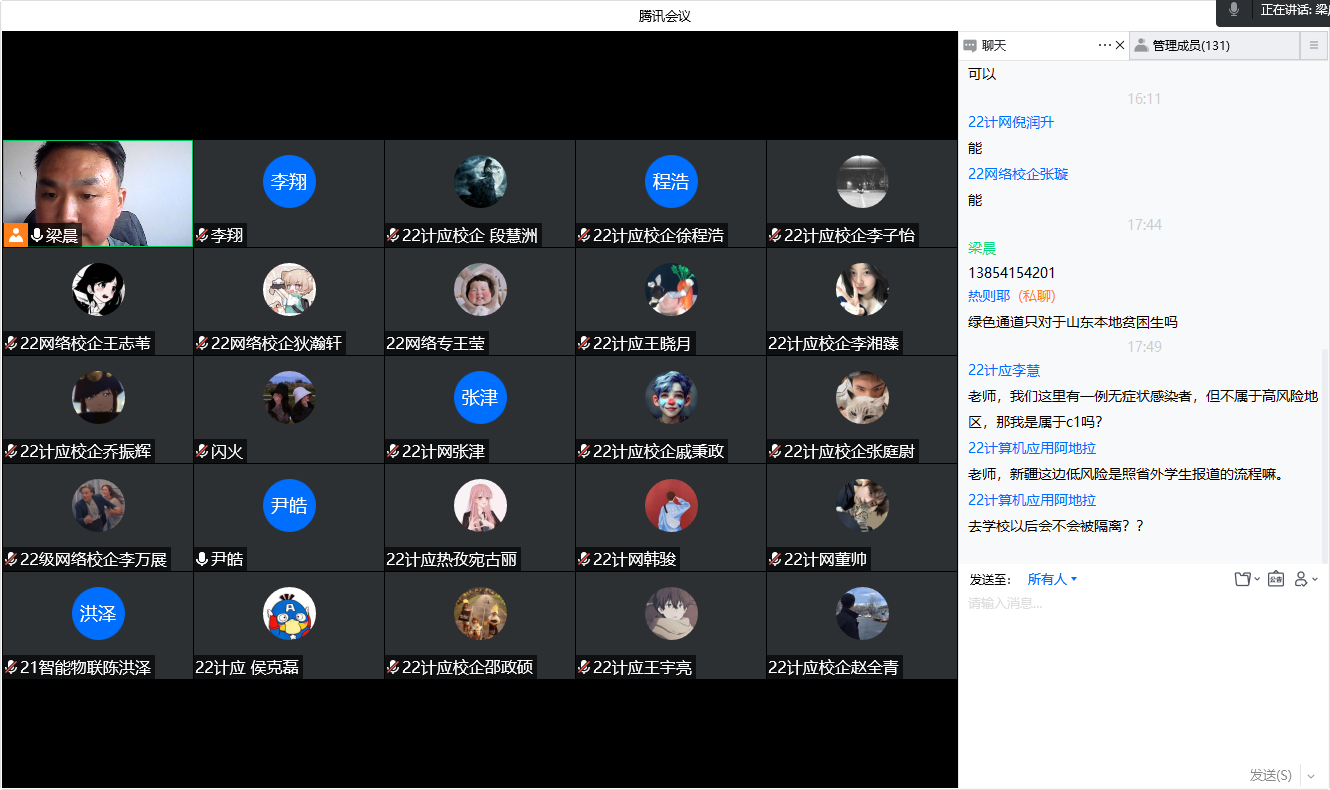 会议伊始,梁晨首先对2022级新生到来表示热烈欢迎,鼓励同学们在大学里树立远大理想、热爱伟大祖国、担当时代责任、勇于砥砺奋斗、练就过硬本领、锤炼品德修为,不负青春,不负韶华。随后,梁晨详细讲解了新生入校报到流程,重点强调入校报到的疫情防控要求,部署全面摸排新生返程信息工作,引导学生如实上报个人旅居史、健康史,“人盯人”建立报到台账。提醒学生做好返校准备,注意出行安全谨防诈骗陷阱。马燕带领新生认真学习 《2022级新生入学须知》,为同学们解答了自主选宿、新生缴费操作、智慧团建、团员转接流程等学生关心的问题。会后同学们满怀对大学生活的憧憬,纷纷在公屏弹幕上提出自己的问题,老师们就问题一一进行详细解答。