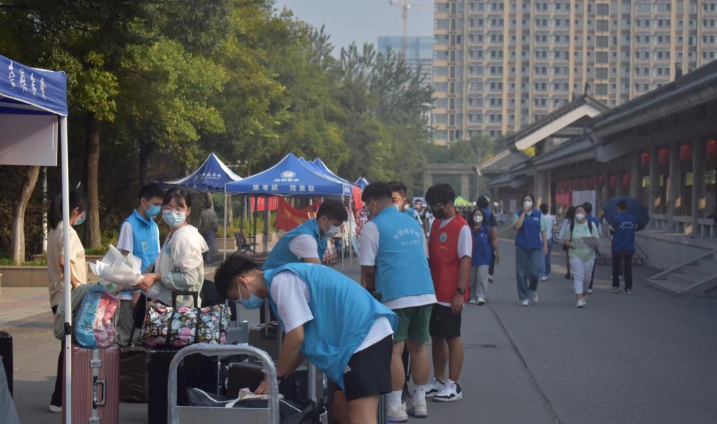 全员参与,热情服务,彰显学院人文关怀。9月13号,迎新工作迎来高峰,学院党政负责人与全体辅导员参加迎新工作,在迎新现场与学生交流解答疑惑,并对细节之处做了进一步强调和调整,鼓励志愿者要继续努力、真诚服务,做好各方面的迎新接待工作。与此同时,学院团总支指导学生会学生干部、迎新志愿者等学生团体分别组建了迎接组、服务组、后勤组、媒体组4个迎新小组,协力共同做好迎新工作。由于疫情影响,今年新生家长不能进入校园,搬运行李就成为了迎新点的重点工作,为此学院专门购置了4台行李板车用以协助新生行李运输,校园中穿梭着身穿红蓝马甲的志愿者的身影,他们不辞辛苦,手提肩扛、借助小推车等工具护送新生行李到宿舍。其中,学生党员们自发组织了一支学生党员先锋队,也加入到志愿服务中来,在迎新期间帮助新生答疑解惑,协助新生们搬运行李,指导并护送新生报到、熟悉校园环境,彰显学生党员的先锋模范带头作用。受到现场气氛的感染,新生中来自2022级商务英语班的夏凯迪、王宏峰两位男同学到宿舍放下行李后就转身主动要求加入到志愿服务队伍中,成为了志愿服务队中年龄最小的两位成员。