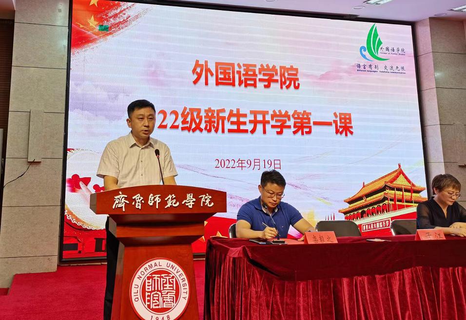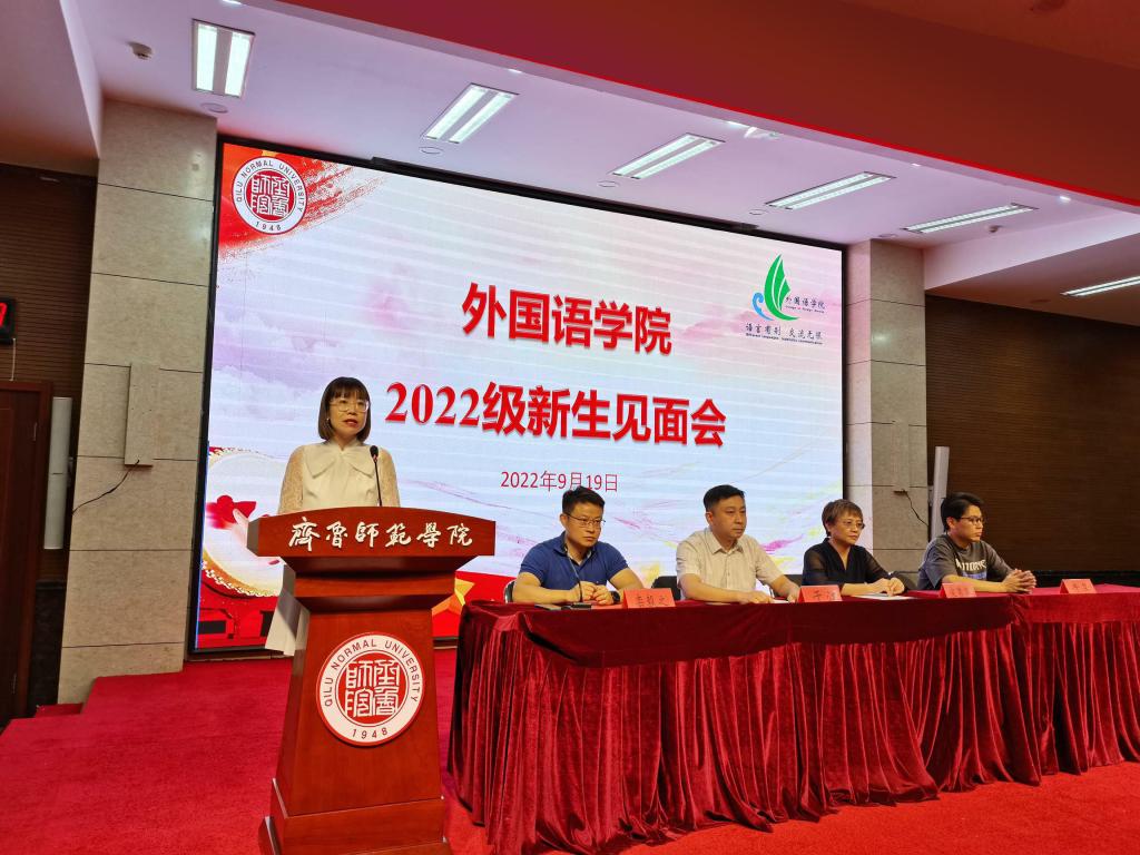 为帮助学院2022级新生更好的了解校园,树立大学奋斗目标,开展好新生入学教育,进一步推动外国语学院学风建设。外国语学院于9月19日晚在章丘校区图书馆学术报告厅召开2022级新生见面会。外国语学院院长宋秀葵、党委书记于江出席会议,团总支书记牛荦、团总支副书记王伟、辅导员倪冉、刘欣欣、邵河,2022级新生班主任以及2022级全体学生参加会议。会议由学院党委副书记栾毅之主持。