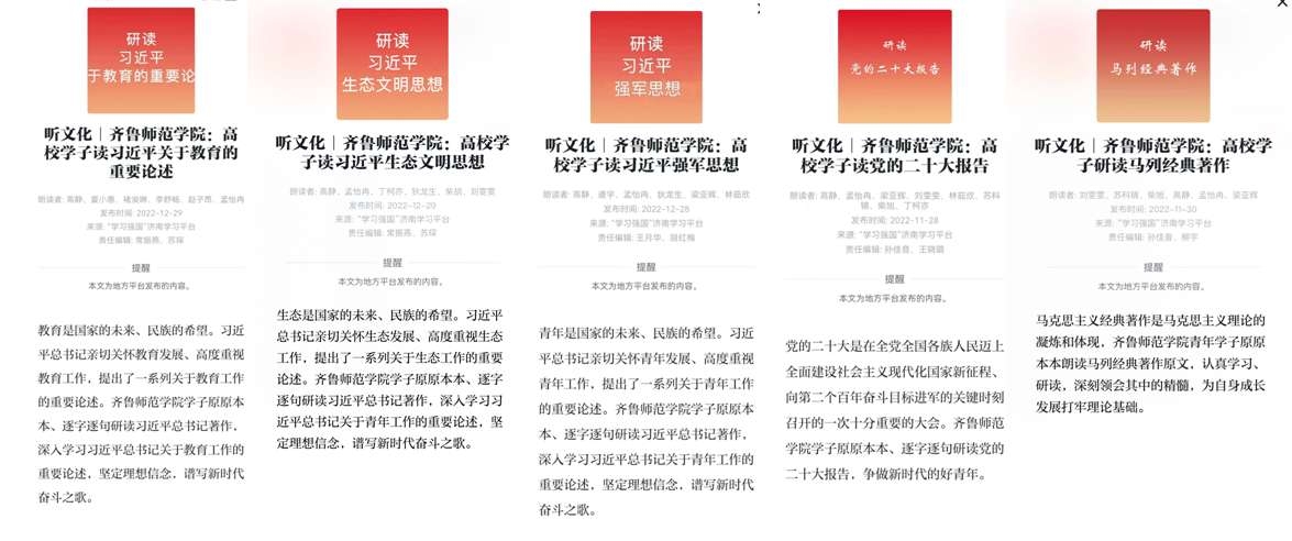 为深入学习宣传贯彻党的二十大精神,引领青年学子坚定不移听党话、跟党走,立志做有理想、敢担当、能吃苦、肯奋斗的新时代好青年,马克思主义学院于2022年12月启动了“诵读经典原著,凝聚时代力量”初心颂系列活动,并陆续登上“学习强国”平台,传播正能量。