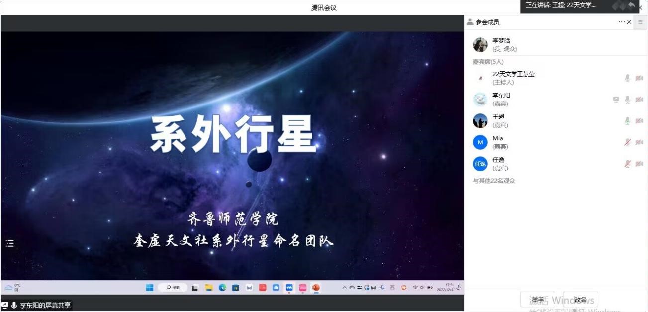 为了设计提出更好的命名活动方案并做好宣传,奎虚天文社在参加NameExoWorld2022活动的前期,先于2022年12月4日开展了一场主题为“系外行星”的线上科普活动。该活动主要由团队成员向大家介绍关于太阳系外行星的基本概念、分类和特点,以及系外行星是如何被发现的,同时邀请天文学专业老师对本次科普活动进行点评和补充讲解了相关专业理论知识,从而为参加太阳系外行星世界命名活动汲取灵感和做好充足准备。