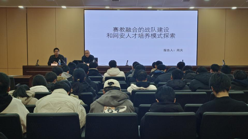 报告会上,周庆介绍了网络空间安全学科概况,以及当下网安学科的安全理念,并在纳新、备战、策略、育人等方面详细讲解了赛教融合的CTF战队建设。此外,周庆基于战队视角分享了赛教融合培养网安人才的体会。通过周庆深入浅出的讲解,师生对网络空间安全有了更深入的了解与认识。在交流环节,周庆与参会师生进行互动,并耐心解答了大家的提问。
