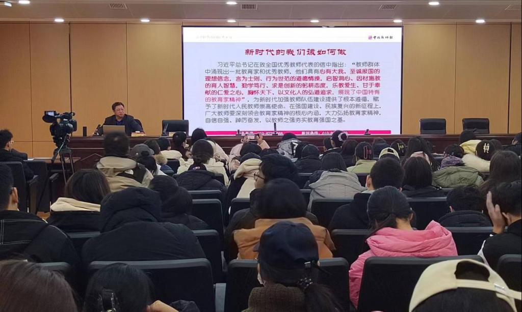 吕同舟作了《做一名“明亮”的教师》专题讲座,讲座中分别从什么是“明亮”教师、“明亮”教师的特点、如何成为一名“明亮”教师三个方面进行了深入浅出的阐释,他提出“明亮”教师要心中有光、眼中有人、课中有魂。作为一名“明亮”教师要懂得为谁而教、教什么、怎样教,还要懂得将心中的“光”传递给学生,以一己“烛光”换学生满天“星光”。吕同舟带着深度的思考,在教育家的成长路径上为师院学子们打开了一扇窗,引领学子们思考如何成为大先生,大先生需要做怎样的准备,从心有大我、至诚报国的理想信念,言为士则、行为世范的道德情操,启智润心、因材施教的育人智慧,勤学笃行、求是创新的躬耕态度,乐教爱生、甘于奉献的仁爱之心,胸怀天下、以文化人的弘道追求六个维度深刻解读了新时代的教育家精神的实质和内涵,并鼓励“大地明师班”的学员们弘扬教育家精神,学会坚持、善于总结、不断改进、自我修炼、逐步进阶,在未来平凡的教师岗位上,做一名“明亮教师”。