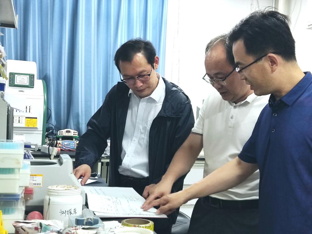 座谈会后,张海龙、崔大勇、朱广伟一行又来到实验室进行现场调研,与正在进行大学生创新创业训练的学生进行亲切交流。