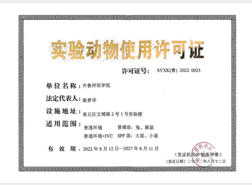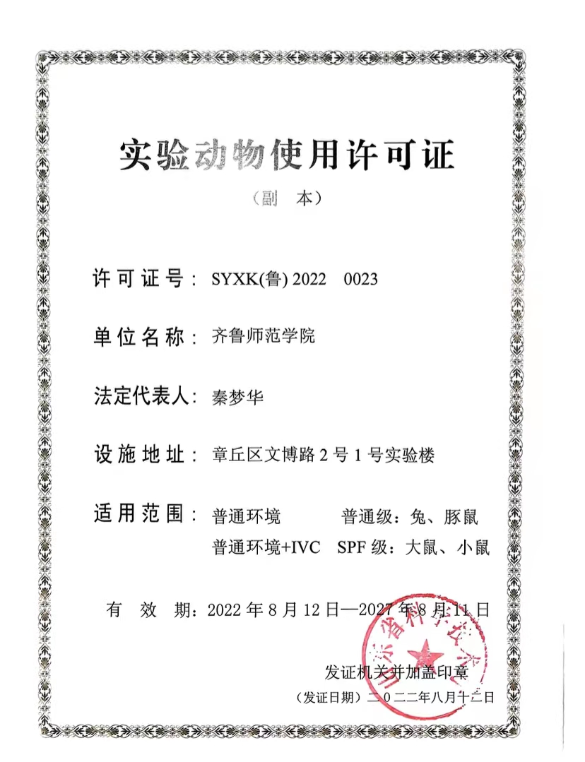 化学与化工学院毒理室的实验动物使用许可证适用范围为普通环境:兔、豚鼠;普通环境+IVC:SPF级大鼠、小鼠。实验动物使用许可证的取得,对学院实验动物的饲养、使用标准化和规范化具有重要意义。为提高学院科学研究能力、承担重点重大科研项目、促进产学研转化、推动毒理学科发展奠定了基础。