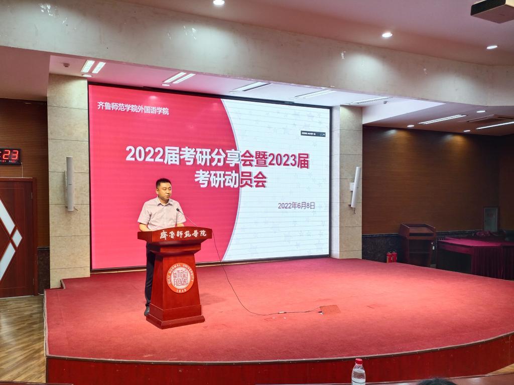 6月8日下午,外国语学院在章丘校区学术报告厅召开2022届考研总结分享会暨2023届考研动员会,外国语学院党委书记于江、院长宋秀葵、党委副书记栾毅之、团总支全体成员以及相关班级班主任出席会议,2019、2020级本科生、2021级专升本全体学生通过线上和线下方式参加会议,会议由栾毅之主持。