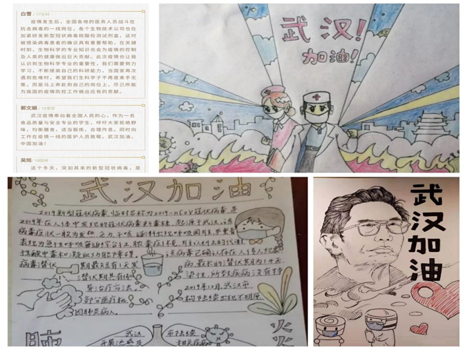 疫情当前,生科学子以防控抗击新型冠状病毒肺炎疫情为主题开展创作。他们用发自肺腑的语言为武汉加油,用手中的画笔为时代画像,致敬奋战在疫情防控一线的勇士们,大家都在用自己的力量服务社会、于己担责,争做走在时代前列的奋进者、开拓者、奉献者。