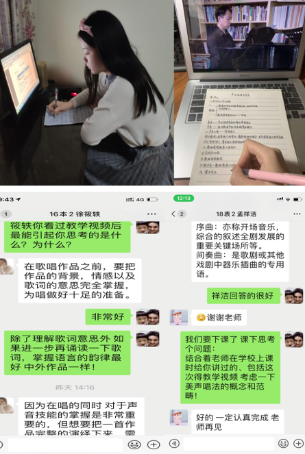 老师课程反馈:在收到学院“停课不停学”的授课任务后,通过两周的网络培训学习和积极的准备,并且,针对音乐学声乐专业技能课的特点,通过教研室的讨论,群策群力上好每节课,我们克服了网络拥堵、学生无练声和学习硬件、一对一上课的针对性等网络授课困难,依托MOOC网络慕课平台,并采用了灵活的授课方式,如微信一对一演唱辅导、微信公众号声乐大师教学视频资料欣赏、APP声乐视频音频资料等,全方位、多形式的教学手段,真正做到了一对一声乐技能课的因材施教,让不同年级、不同程度、不同唱法、不同嗓音特点的学生学有所得,并且教师和学生互动灵活,学生上课和完成作业积极性高,收获了专业知识,开拓了学生的视野,启迪了学生的心智。