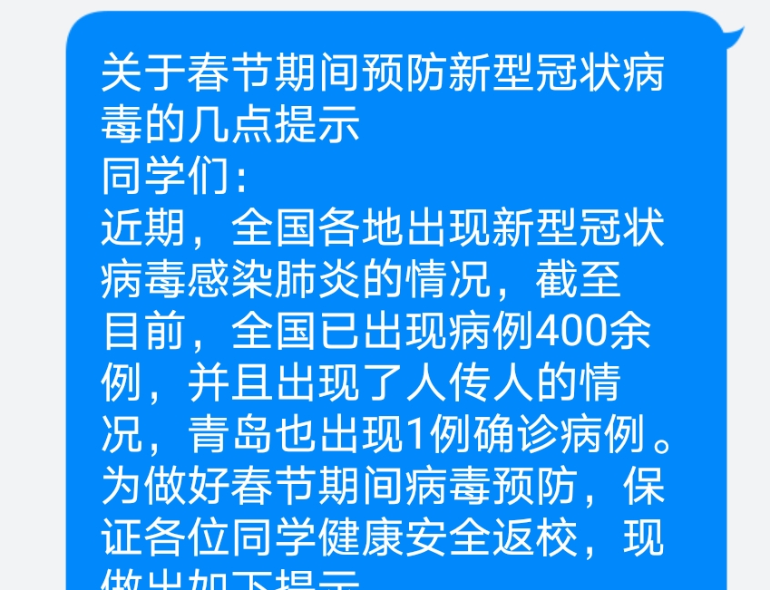 安全就是一切!在意识到新冠病毒危害性较大且可能会在全国大范围蔓延的第一时刻,学院领导展现出高度敏感性,于1月22日面向全体学生发出《关于春节期间预防新型冠状病毒的几点提示》,提醒学生科学防疫、理性防疫。