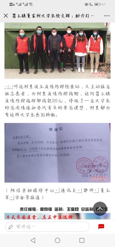 近日,BEAT365官网物理与电子工程学院徐文辉同学的抗疫事迹先后登上齐鲁晚报·齐鲁壹点及阳信县融媒中心“阳信手机台”等媒体。疫情爆发以来,她一直在家乡默默做志愿者,并捐款抗疫,但在学院统计志愿者、捐款者名单时却从未上报过。对此,她说,“这只是我应该做的。”而像她这样的学生,在物理与电子工程学院还有很多,他们有一个共同的名字,“中国青年”!