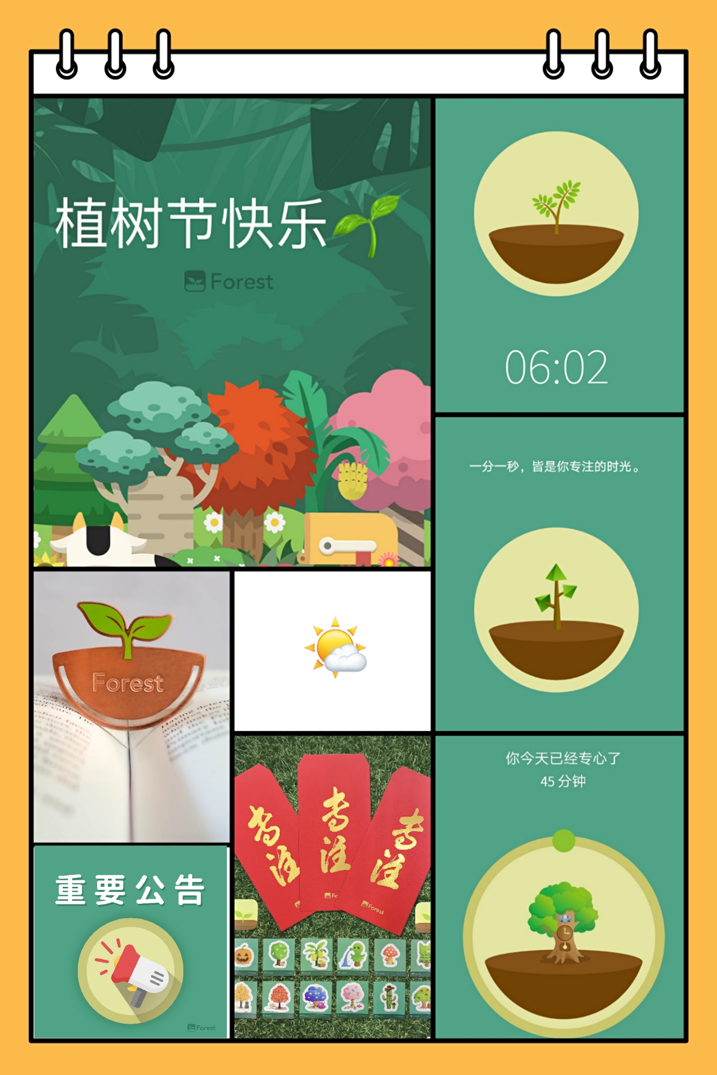 本活动秉持自由自律、自愿参加的原则,同学们自主制定自律养成计划,在“云植树”的同时养成自律的好习惯。参与云植树者均使用Forest软件,每天制定学习计划、设置专注时间,通过不碰手机专注学习以促进“树”的增长。每天专注的次数至少两次,每次不少于30分钟。坚持不碰手机者便可收获属于自己的“树”,半途而废者则会获得一棵枯萎的“树”。本活动以宿舍为单位采取记时制排名,每周定时在本班公布。同时,同学们也可以实际去认领一棵真树,为地球村增加一片绿意。