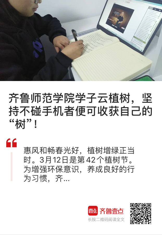 当前,受疫情影响,我们无法出门亲手种下一棵树,化学与化工学院学生通过“云植树”这样的方式,发扬爱树、植树、护树的优良传统。习近平总书记曾指出,植树造林是实现天蓝、地绿、水净的重要途径,要坚持全国动员、全民动手植树造林,努力把建设美丽中国化为人民自觉行动。“前人种树后人乘凉,我们每个人都是乘凉者,但更要做种树者”,不论是践行绿色发展理念还是养成良好行为习惯,都是如此。本次活动将持续进行下去,同学们将通过本活动进一步树立生态文明的意识与观念,养成好习惯、树立新风尚。齐鲁晚报·齐鲁壹点已对此活动进行报道。