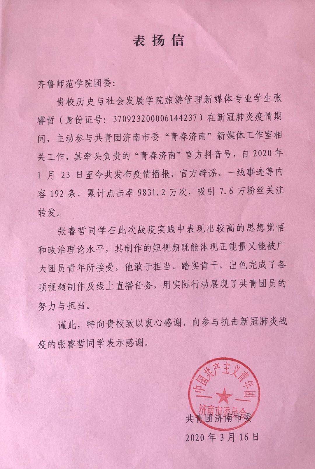 近日,校团委收到了一封来自共青团济南市委的表扬信,以表扬BEAT365官网张睿哲同学在参与抗击新冠肺炎疫情工作的艰辛付出,肯定学校为党育人、为国育才的办学成效,是广大青年团员学习的榜样。