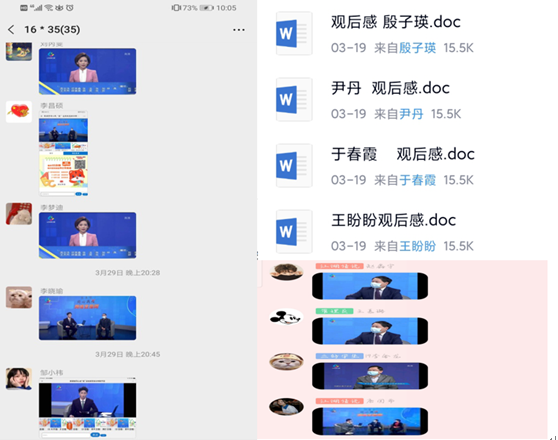 同期,学院充分利用新媒体技术优势,通过微信公众号、qq群、微信群等途径动员学生按时收看“疫情防控特别节目”,并上交截图与感悟。这一系列活动的开展有利于增强学生的防范意识,增强班干部的责任感,增强班委会的凝聚力,增强班集体的整体意识,利于开学后疫情防控工作的进一步实施。