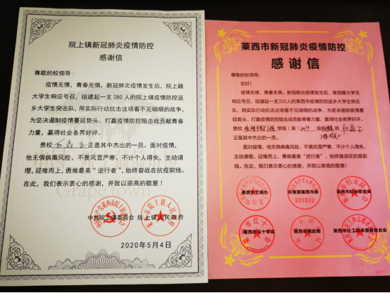9日上午,物理与电子工程学院收到莱西市人民政府、莱西市院上镇人民政府发来的感谢信,信中对学院学子耿鑫生积极参与疫情防控志愿服务工作一事给予充分肯定,称赞其为“迎难而上的最美‘逆行者’”。