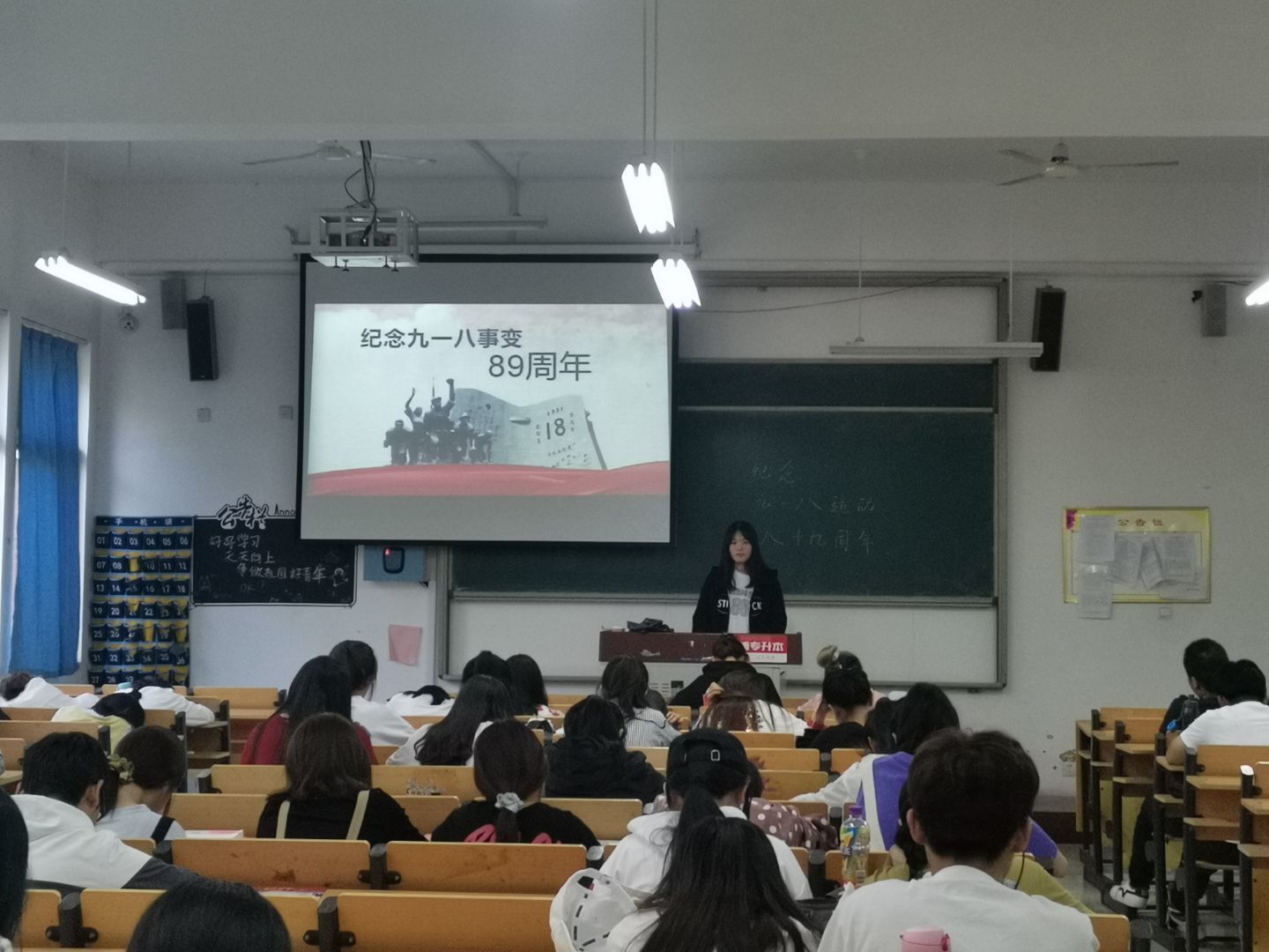 会议由各班团支书主持,通过还原“九一八事变”的本来面貌,重现“东亚病夫”“华人与狗不得入内”那些沉重而痛苦的回忆,由此引出“吾辈当自强”的理念。在当今繁盛昌荣的时代下,当今青年学生更应该铭记历史,牢记使命。九一八的警报是穿越时空的警报,时刻提醒当今青年学生自强不息,努力奋斗。随后,19级全体同学起立,怀着沉痛的心情进行默哀,让我们静静的追思、深深地缅怀,把最深情的祝福和最崇高的敬意,送给保卫我们祖国的英雄们!
