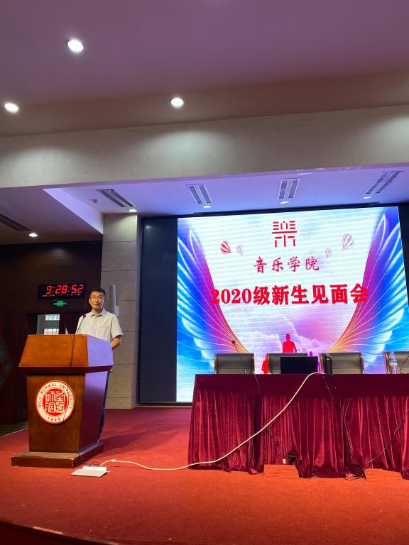 9月24日上午,音乐学院2020级新生见面会在图书馆报告厅隆重举行。音乐学院党总支书记王德民、院长万梅红、副院长常爱玲及办公室、团总支负责人、辅导员、新生班主任和2020级全体新生参加了见面会。会议由音乐学院党总支副书记马艳主持。