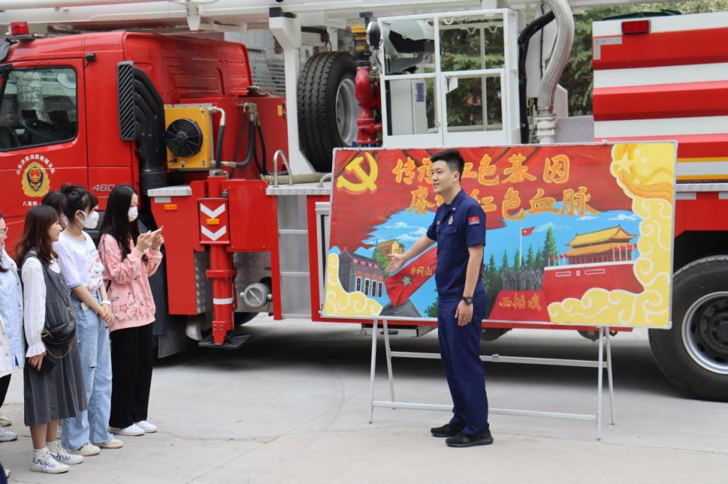 本次除了参观消防站和学习消防知识外,通过“党建带团建”,重温党的光辉历程,继承和发扬党的优良传统,党史交流学习是本次活动的重中之重,因此八里桥救援站指战员们与同学们共同交流了党史学习的经验。2020级小学教育(3+4)本科一班的团支部书记王国威同学首先介绍了团支部全体成员党史学习的情况,展现了青年大学生们传承红色基因的决心。八里桥消防救援站的通讯员曲治伍同志根据站内开展的党史学习教育,向同学们展示了指战员们“对党忠诚、纪律严明、赴汤蹈火、竭诚为民”的决心。