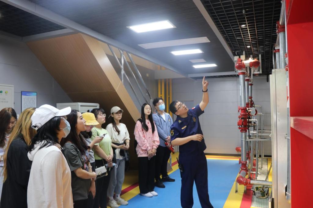 八里桥消防救援站政治指导员路峰同志向同学们的到来表示了热烈的欢迎。八里桥消防救援站战斗班班长吴浩冉同志向同学们展示了消防器材装备;路队长了解到学校近期正就学生宿舍消防安全问题展开相关排查整改活动,于是带领同学们走进消防安全体验中心,向同学们介绍了日常公共消防设施及用法,科普了宿舍生活中易发生的危险情况及处理方式,为同学们敲响警钟。