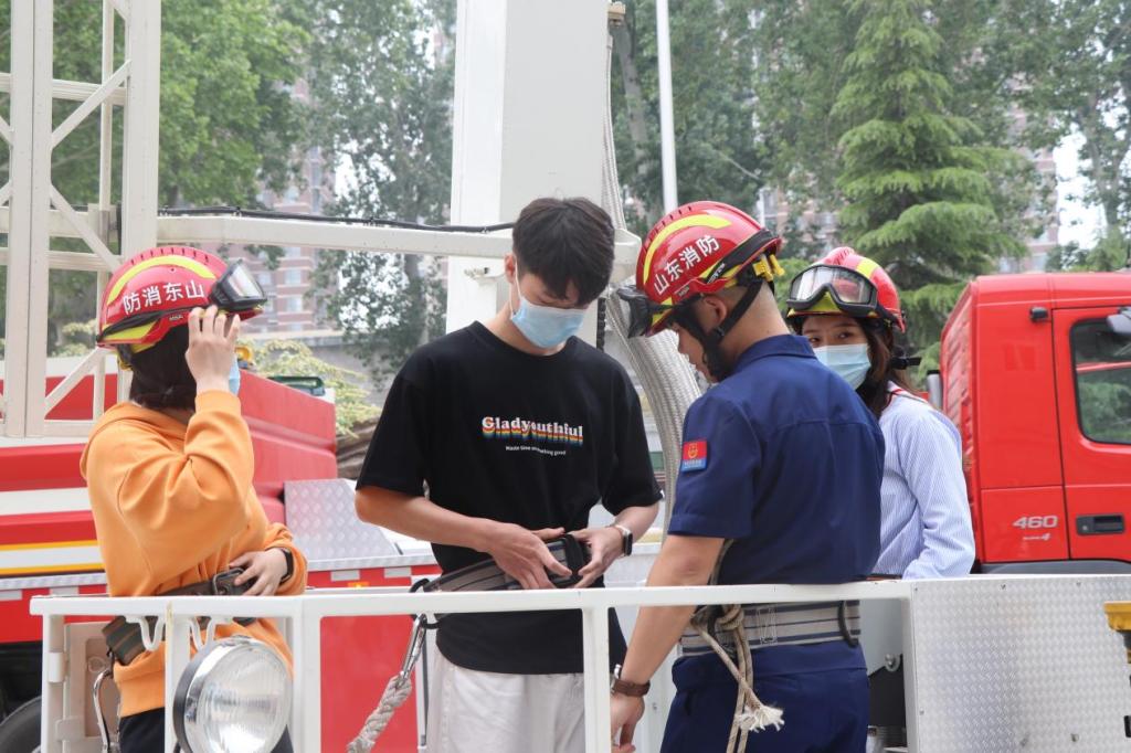 参观期间,同学们穿上消防服,站上云梯消防车,走近消防员们的宿舍,学习叠“豆腐块”被子,体验了一把当消防员的感觉。