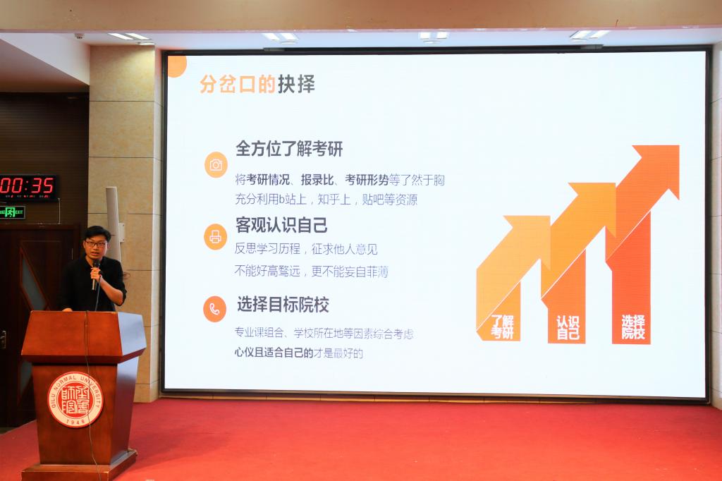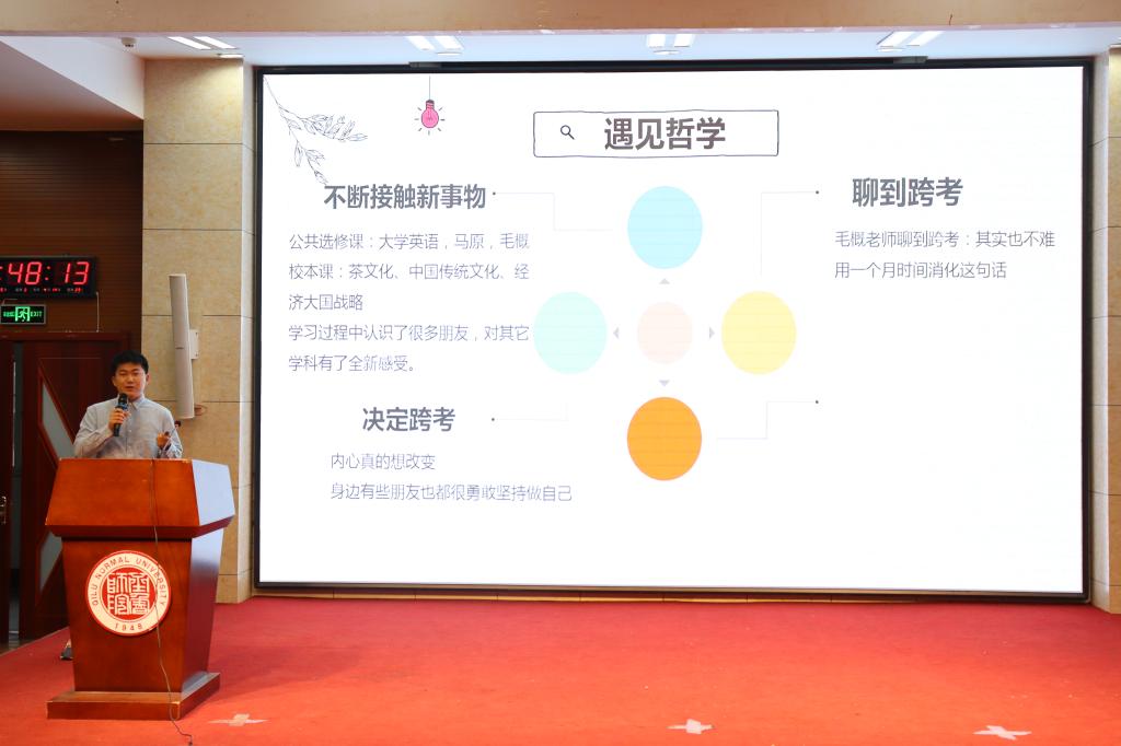 高壮壮用诙谐幽默的语言将自己考研的全过程娓娓道来。他讲述了自己确定跨考的心路历程,分享了为考取心仪院校获取资源信息的途径以及备考通用的技巧经验。他鼓励同学们应把握每一次机会,勇敢探索未知。