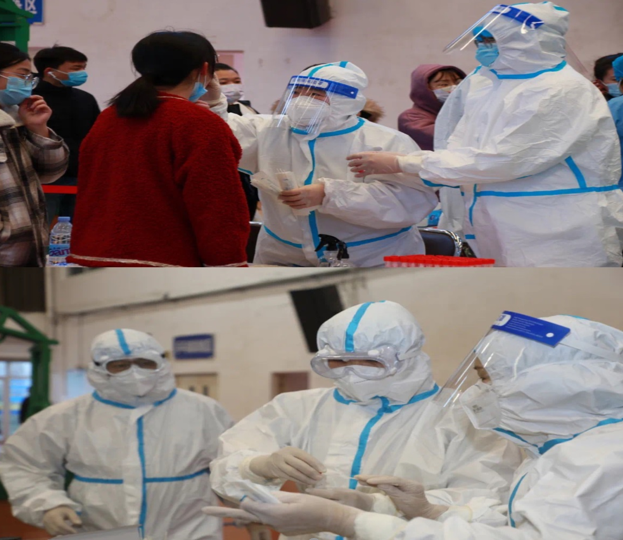 天气微凉,老师会贴心地提醒降温记得多加衣。同学们有序排队,按照流程有条不紊地进行核酸检测。坚守在岗位上的医护人员和志愿者老师,汗水早已经浸湿了防护服,护目镜在脸上勒出红印,护目镜里的水汽模糊了视线 手中的工作却仍然紧密地进行着,装管、贴签、封存……给予我们心中的安定。