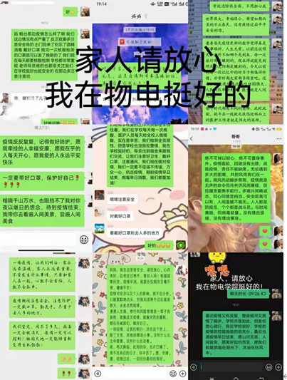 在疫情形势严峻形势下,为避免远隔在外的家人担心,物电学子们及时与家人沟通交流,反馈当前学校生活学习情况和防疫措施,使家人紧张的情绪得到有效缓解。老师们也召开线上家长会,分享当前疫情形势与教育经验,反馈学校防疫政策,打通家校联系,共同守护学生和校园平安。相距千山万水,却阻隔不了父母的牵挂与担心,物电学子用行动告诉父母:“爸妈,我在学校挺好的,请放心!”