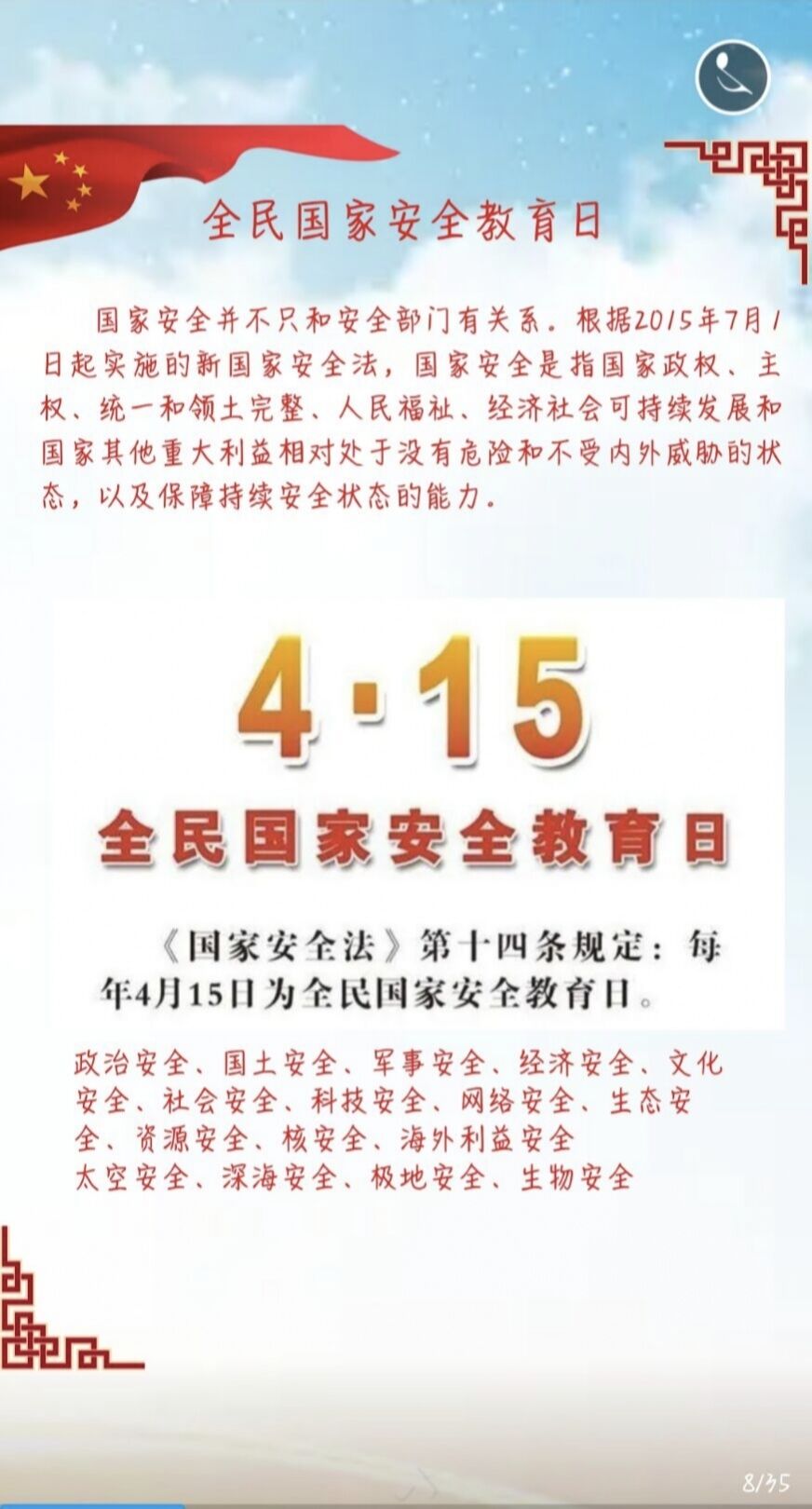 4月15日,化学与化工学院围绕“树牢总体国家安全观,感悟新时代国家安全成就,为迎接党的二十大胜利召开营造良好氛围”的主题,转发安保处全民国家安全教育的推文链接,向各班宣传普及了总体国家安全观的五大要素和五对关系、国家安全的具体内容,以提升同学们的国家安全意识,推动全民国家安全观深入人心。