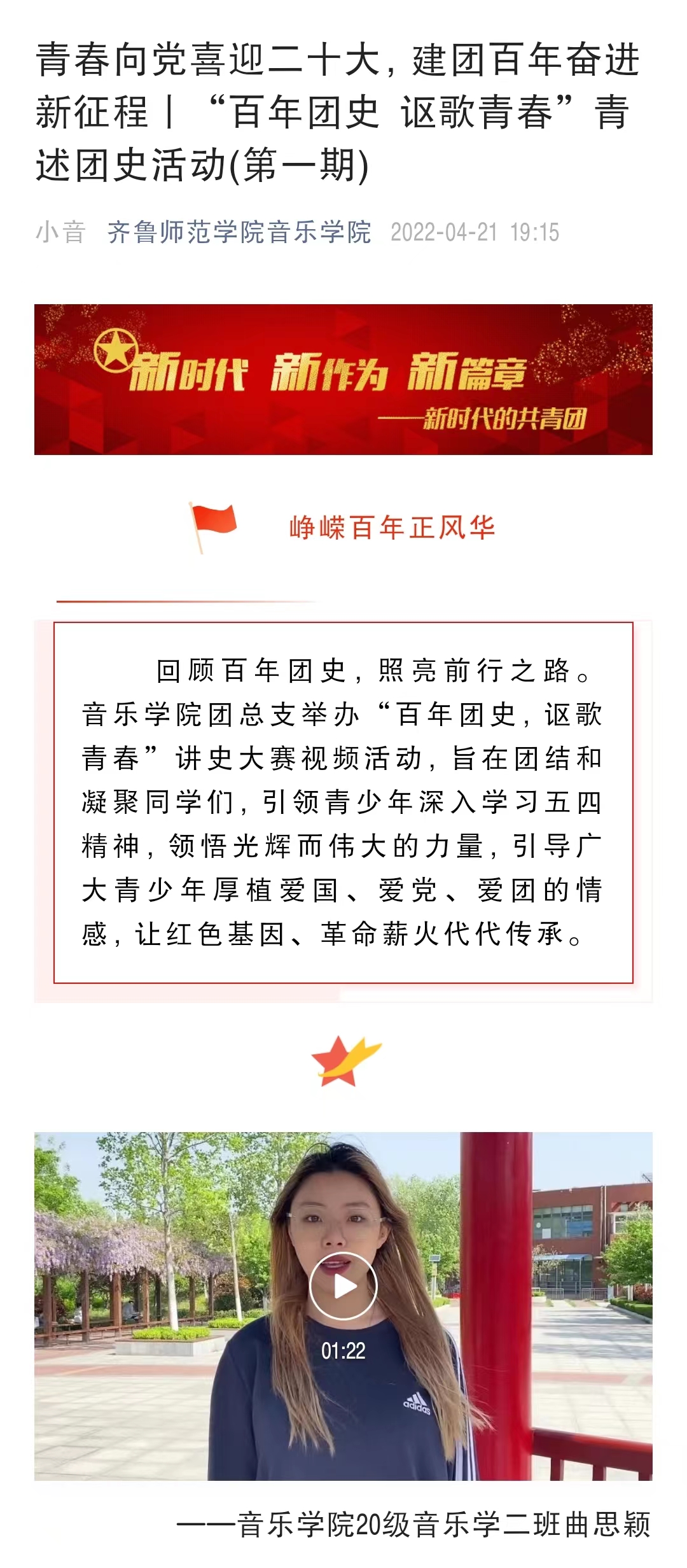 为深入学习贯彻习近平新时代中国特色社会主义思想,引导广大团员青年继承和发扬五四运动的光荣传统,展现青年学生奋发有为的良好精神风貌和青春风采,以实际行动献礼共青团建团100周年,音乐学院团总支以“听、宣、述、建、竞、致”为重点,开展“青春向党喜迎二十大,建团百年奋进新征程”系列主题教育活动。