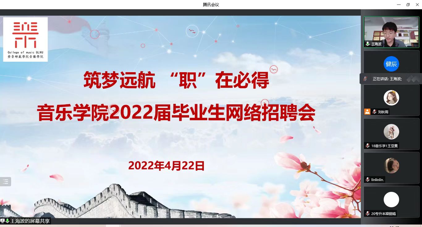 会议伊始,音乐学院毕业班辅导员王海波向用人单位简要介绍了学院的办学特色、办学定位、人才培养模式及学院2022届毕业生整体情况。本次专场招聘会共有济南市历下区铭师教育培训学校、济南市市中区艺博文教育培训学校、山东名韩教育信息集团有限公司、威海非凡少儿艺术培训中心4家企业抛出“橄榄枝”,在招职位50余个,为广大音乐学、舞蹈学专业毕业生就业打造了一个良好、坚实的就业平台,提供了大量优质就业岗位。考虑到疫情防控现状,本次招聘会采取网络招聘形式开展,同学们只需线上投送简历,极大程度的减少了同学们寻找岗位中的困难。